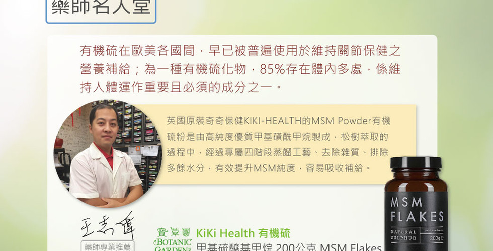 有機硫又稱甲基硫醯基甲烷 (Methylsulfonylmethane,簡稱MSM) ,在歐美各國間,MSM早已被普遍使用於維持關節保健之營養補給;MSM(Methyl-Sulfonyl-Methan)為一種有機硫化物,85%存在體內多處,係維持人體運作重要且必須的成分之一。人們隨著年齡增長,體內合成MSM的能力減弱,進而影響生理機能調節。